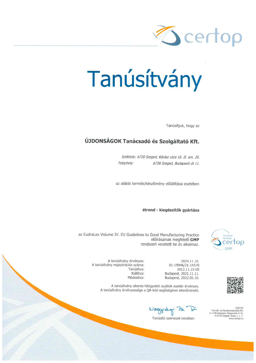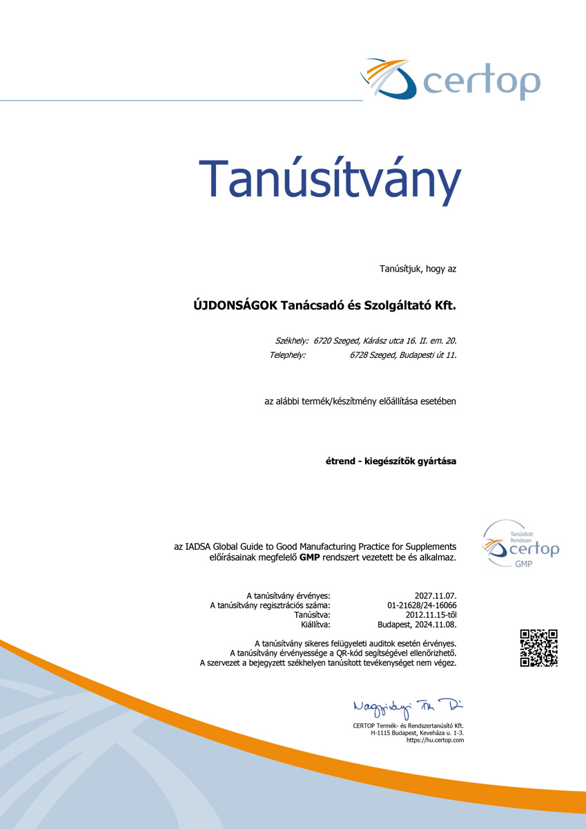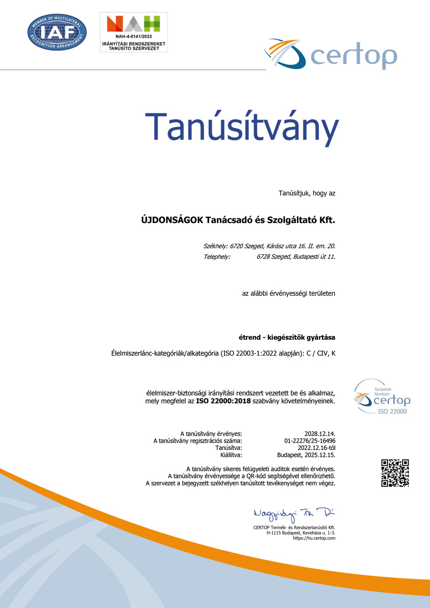 szabványosított előírásokat követjük, eljárásaink az ISO 22000:2018 standard szerint kerültek